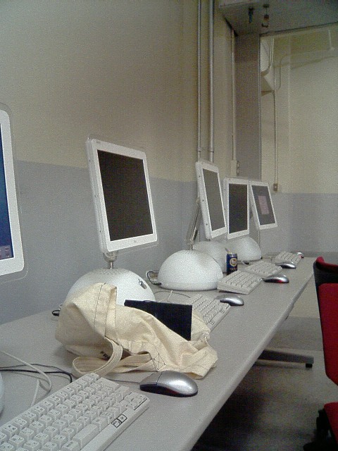以前、東大にiMac一斉配備というニュースを書きました。期待しながら大学に行ったんだけどなぁ。パソコンひとつじゃ雰囲気変わるわけないと気づかされた。ディスプレイのばらばらに曲がった首が苦悩の表現にしかみえない。おまけにMac激使いにくい‥携帯で撮ったらこんな感じに。
